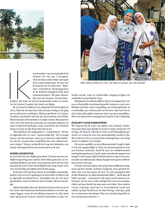 Ik ontmoette Alpha in een salsaclub in Amsterdam in 2002. Hij trok me aan door zijn serieuze inslag en ik ging me in zijn leven verdiepen. Hij was gevlucht uit Guinee Conakry, een land in de bult aan de westkust van Afrika. Hij werd mijn schoonmaker en mijn vriend. We praatten uren over zijn land: de armoede, de corrupte regimes, de man-vrouwverhoudingen, maar vooral hoe de vrouwen eraan toe zijn in zijn land. Hoe leven ze?