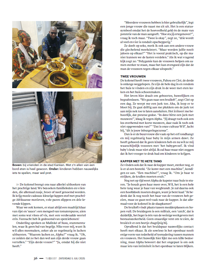 “Meerdere vrouwen hebben is hier gebruikelijk”, legt een jonge vrouw die naast me zit uit. Het is een statussymbool omdat het de hoeveelheid geld èn de mate van potentie van de man aangeeft. “Hoe sta jij er tegenover?”, ik vraag het toch maar. “Twee is okay”, zegt ze, “drie wordt al veel en vier is ronduit opschepperig.”