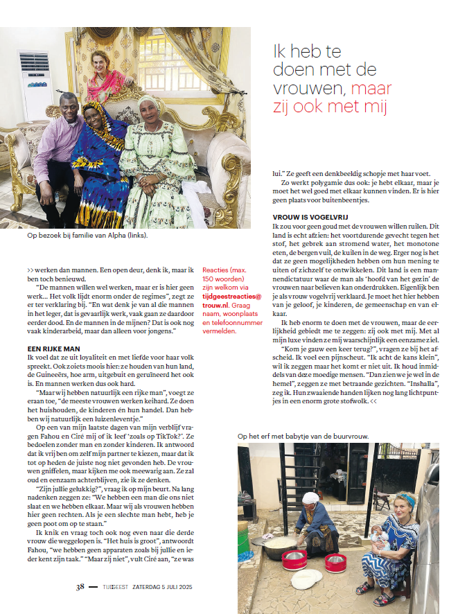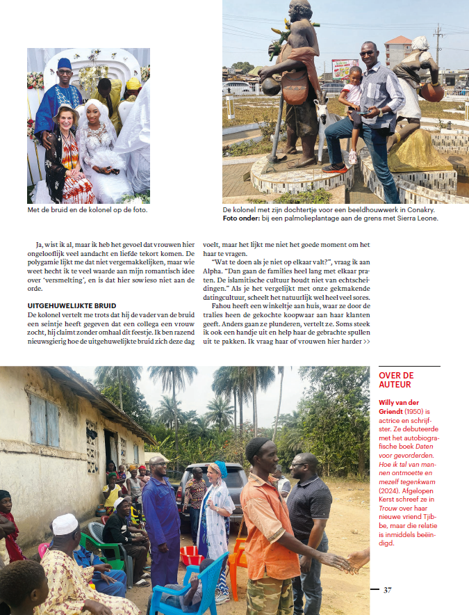 Polygamie en uithuwelijken zijn de standaard in Guinee, al is de man sinds 2019 verplicht om toestemming te vragen aan zijn eerste vrouw als hij een tweede wil trouwen. Maar of daarop toegezien wordt is zeer de vraag. Huiselijk en seksueel geweld komen er veel voor. Meisjes worden vaak vroegtijdig van school gehaald en vrouwelijke pro-democratie-activisten zijn hun leven niet zeker (dat geldt trouwens ook voor de mannelijke). Met een kleurcode-oranjegevoel stap ik in het vliegtuig.